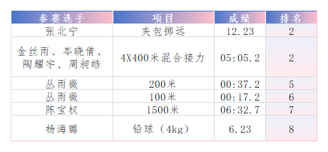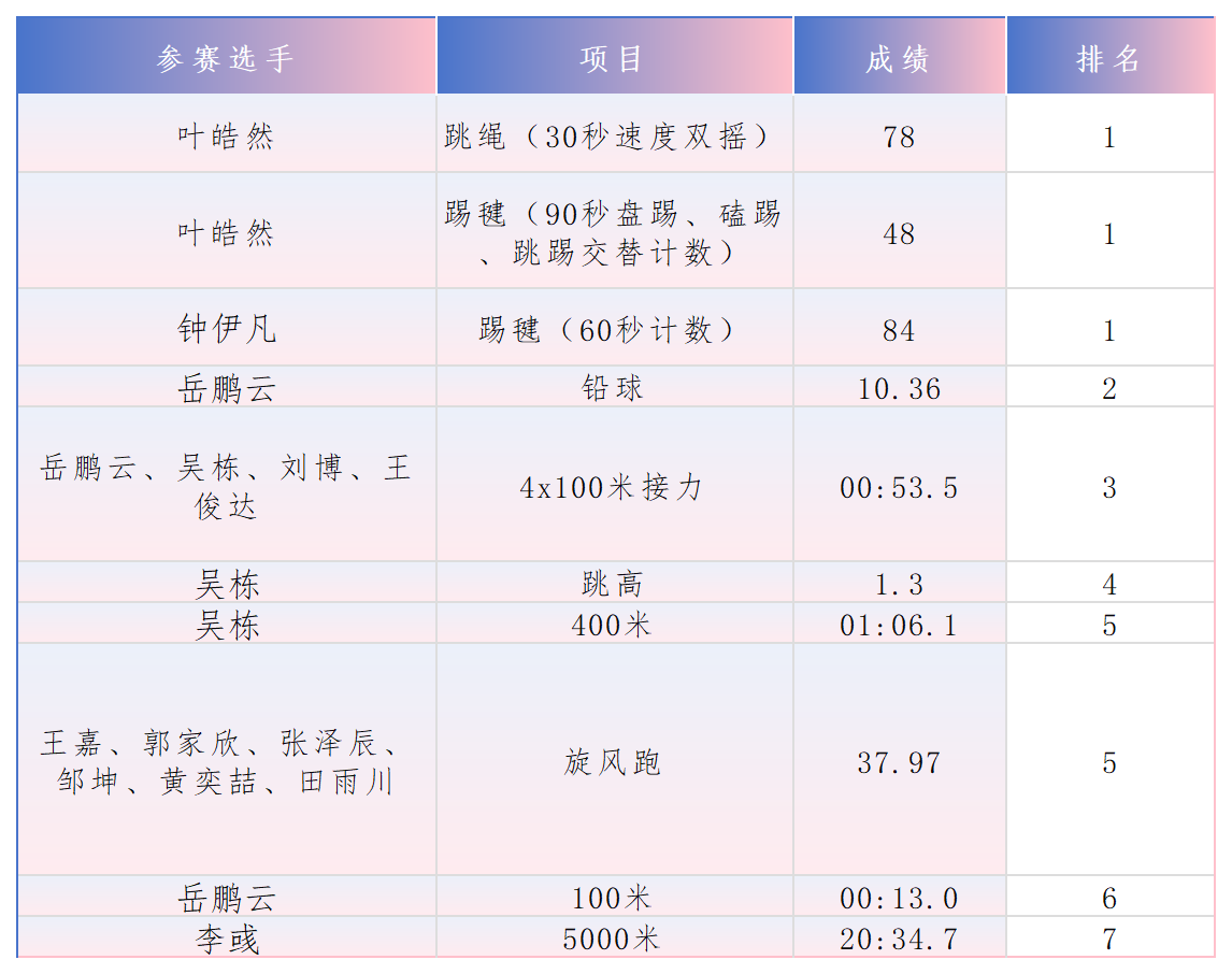 学生共参加了10项比赛,全部获得名次,3项获得冠军、2项分获亚季军,总积分收获了男子乙组第五、男女乙组团体总分第9名的好成绩。