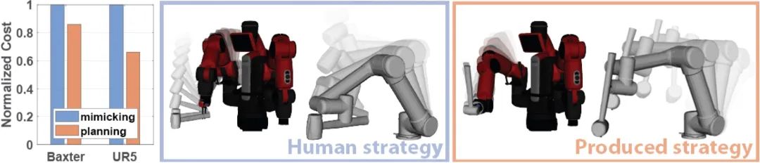 由于运动学结构的显著差异,机器人观察到的人类使用工具的策略对其来说可能并不是最理想的方式。比如两个机器人(即Baxter和UR5)去模仿人类的策略(蓝色)。机器人先观察到人类抓握和使用锤子的方式,然后通过反向运动学(Inverse kinematics)计算出机器人执行同样操作所需要的关节运动轨迹。实验结果证明,直接模仿人类使用工具的方式所需要的扭矩力(Torque effort)要高于文中提出的算法所生成的最佳策略(红色)的。使用该框架产生的工具使用策略和人的策略有很大的不同,但对机器人来说更有效更省力。