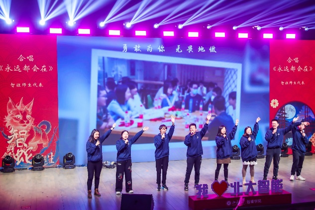 而在晚会的第三篇章—智咏新春中,智班师生代表携手登台,合唱一曲《永远都会在》。在这首充满温情与希望的歌曲中,唱出了智班师生并肩共进、砥砺前行的精神风貌,演绎了对未来的憧憬与对学院的深厚情感,字句间无疑展现出智班的团结一心和凝聚力。